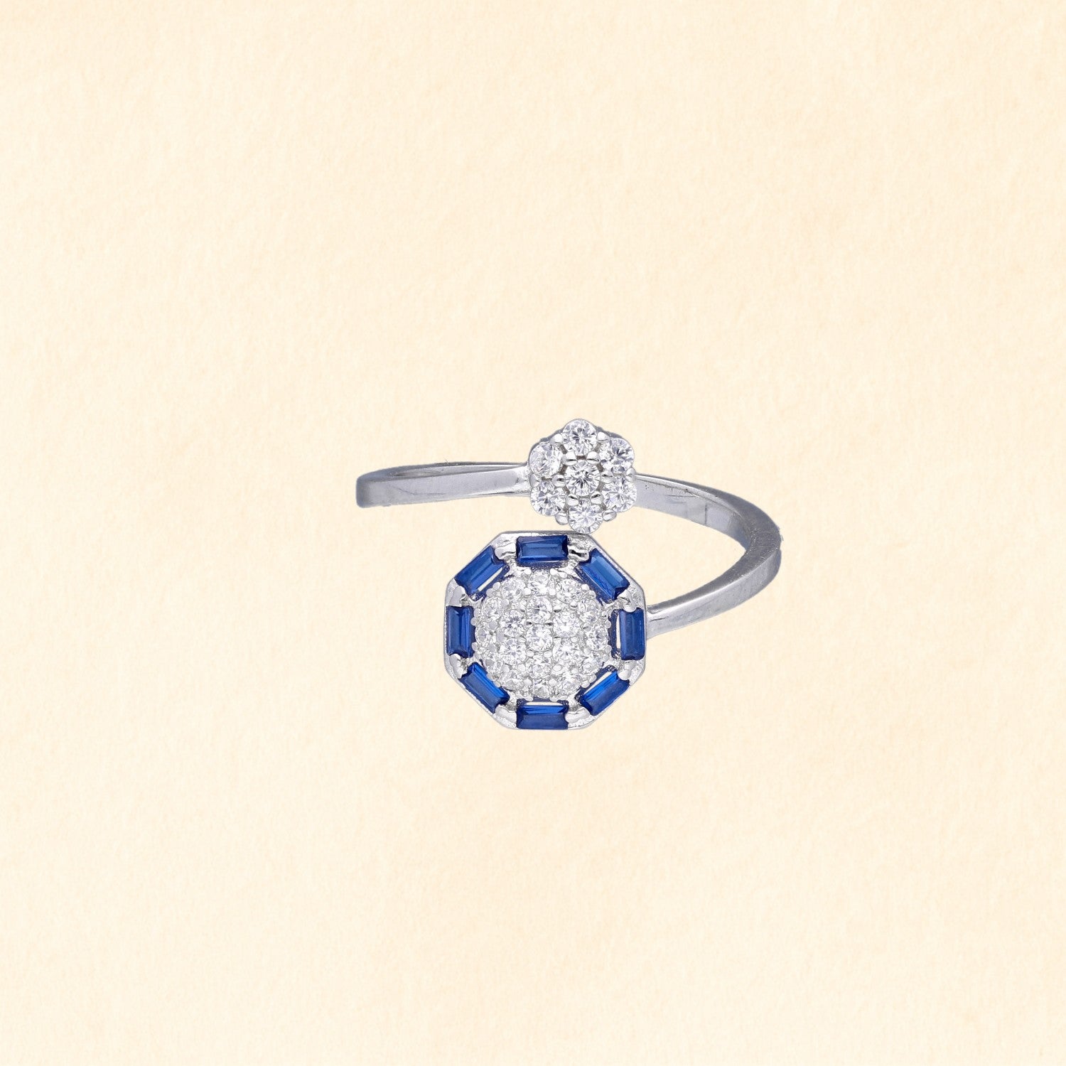 Crafted in 92.5 sterling silver, this finger ring features a unique open design with a zircon-studded flower and an octagon motif accented with deep blue stones, perfect for a modern chic look.
