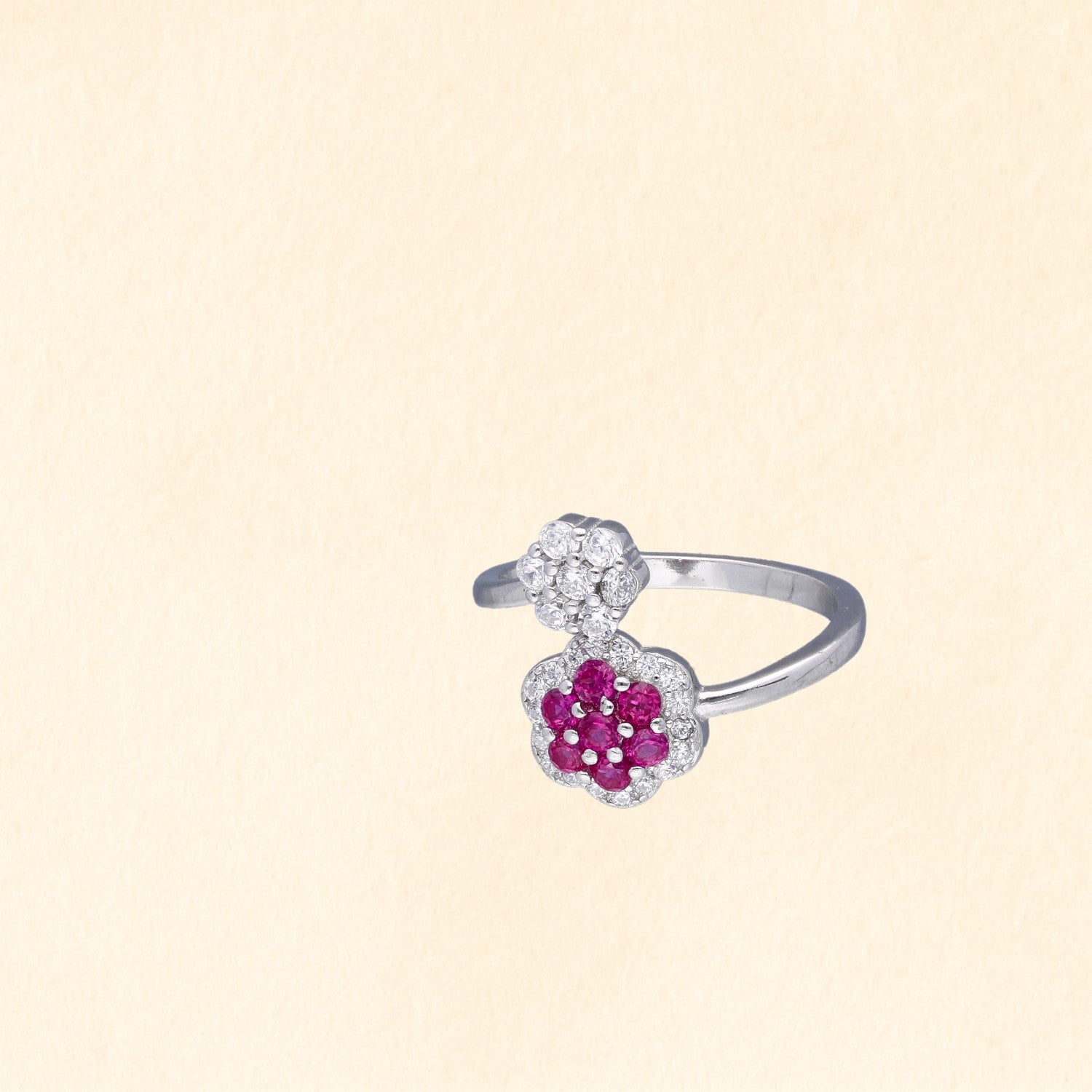 Crafted in 92.5 sterling silver, this stylish finger ring features a dual-flower design with sparkling zircons and vibrant pink stones, making it a perfect blend of elegance and charm for any occasion.
