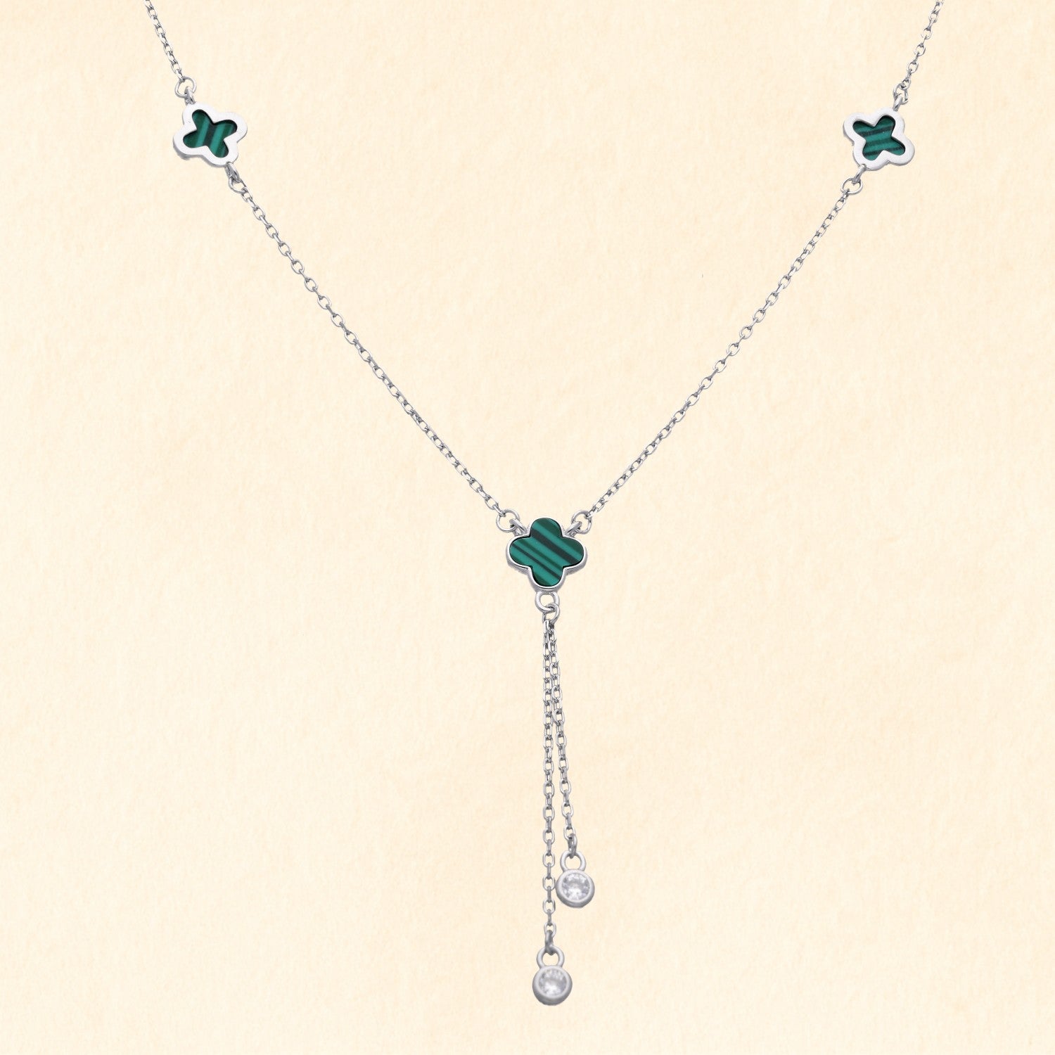 Elegant 92.5 silver necklace with green clover motifs and a drop chain design for a chic look.