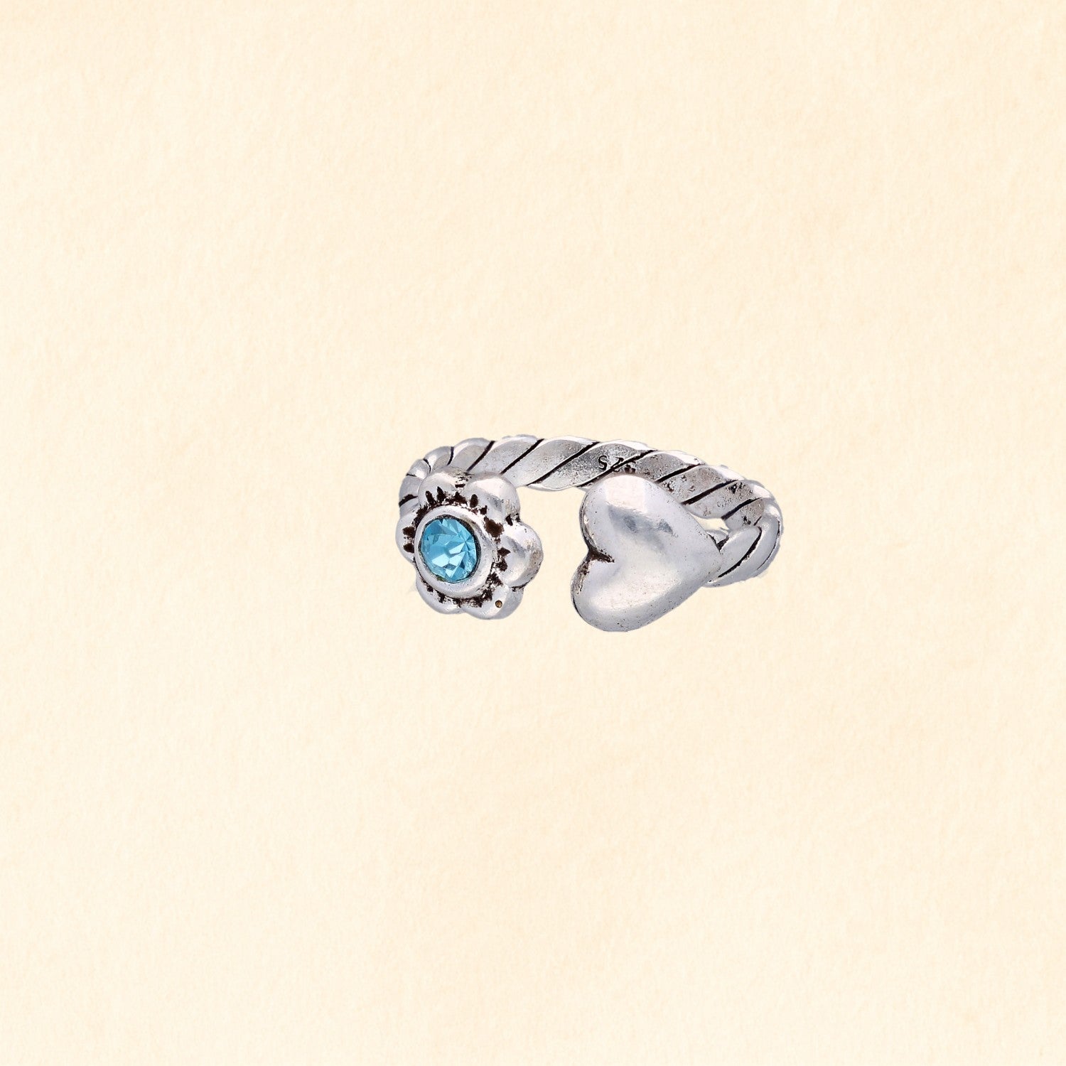 Crafted in 92.5% sterling silver, this stylish toe ring features a twisted band with a heart motif and a delicate flower accented with a sparkling blue stone. It comes as a set of 2 pieces, designed with an adjustable band for a comfortable fit. A perfect blend of playful charm and elegance, ideal for daily wear or special occasions.