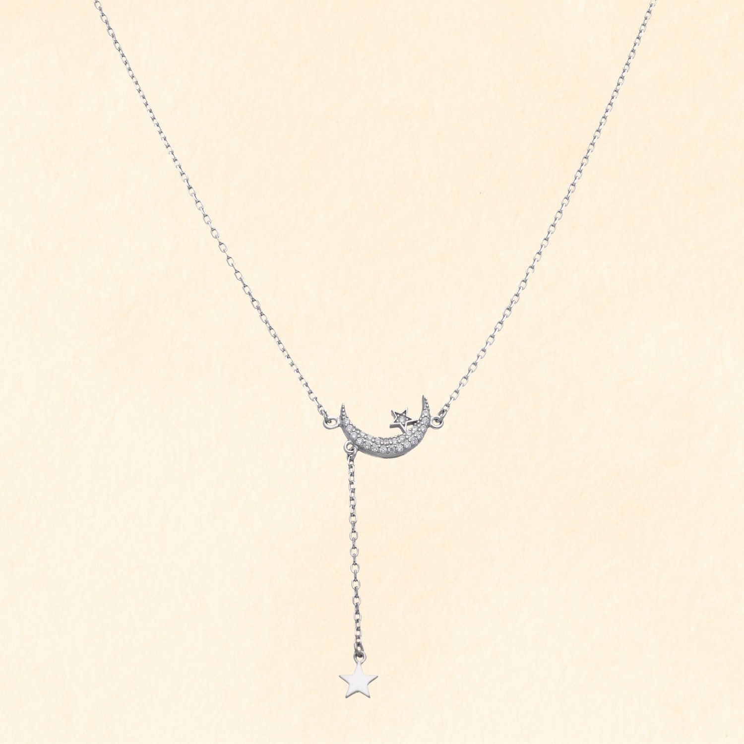 Elegant 92.5 silver necklace featuring a crescent moon with dangling star design, perfect for a celestial look.