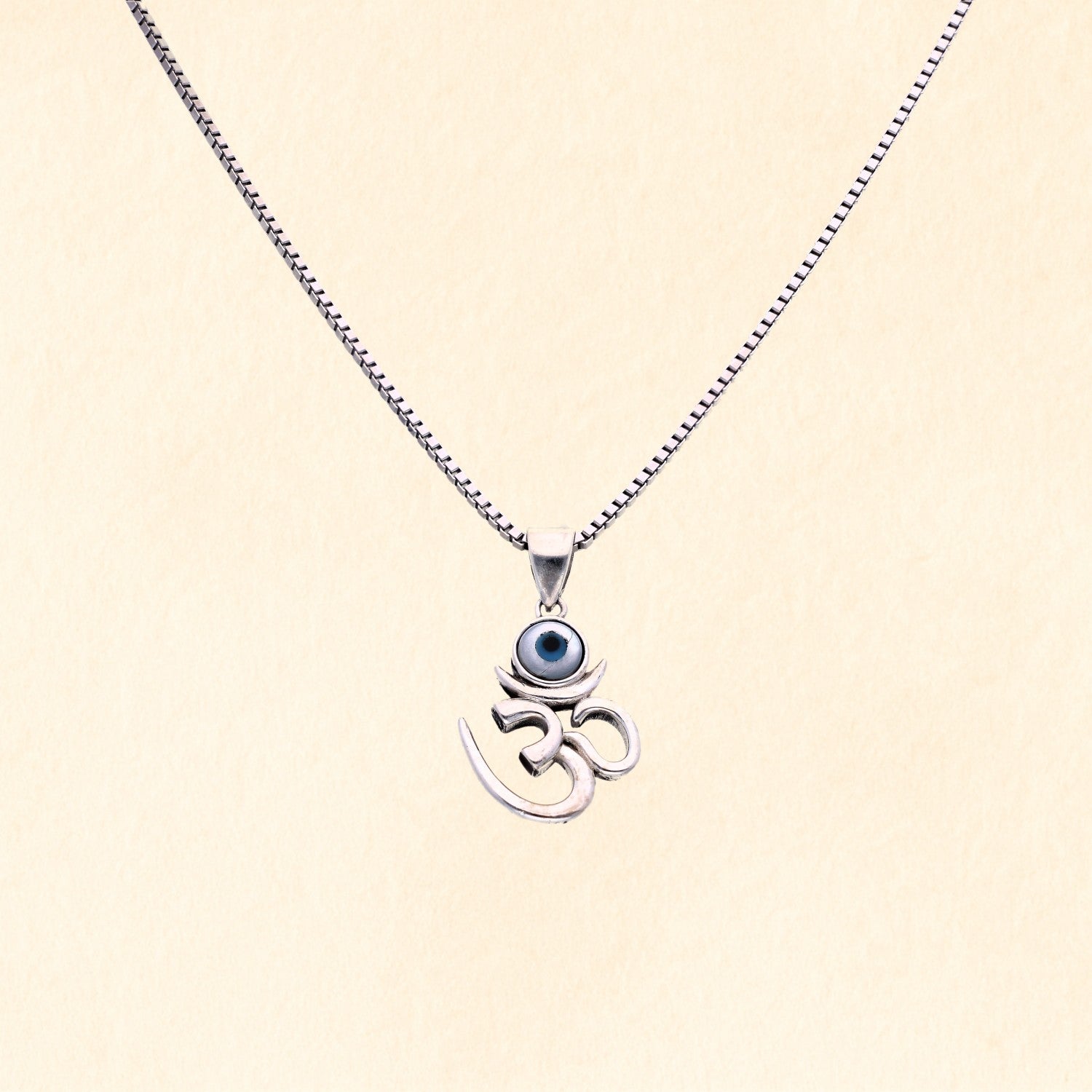 Sterling silver men’s pendant chain featuring an Om symbol with evil eye design, offering protection, positivity, and timeless style.