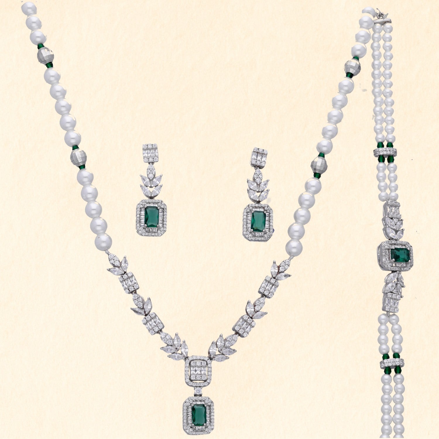 Elegant pearl and silver jewellery set featuring emerald stones and sparkling CZ detailing, perfect for bridal and festive occasions.