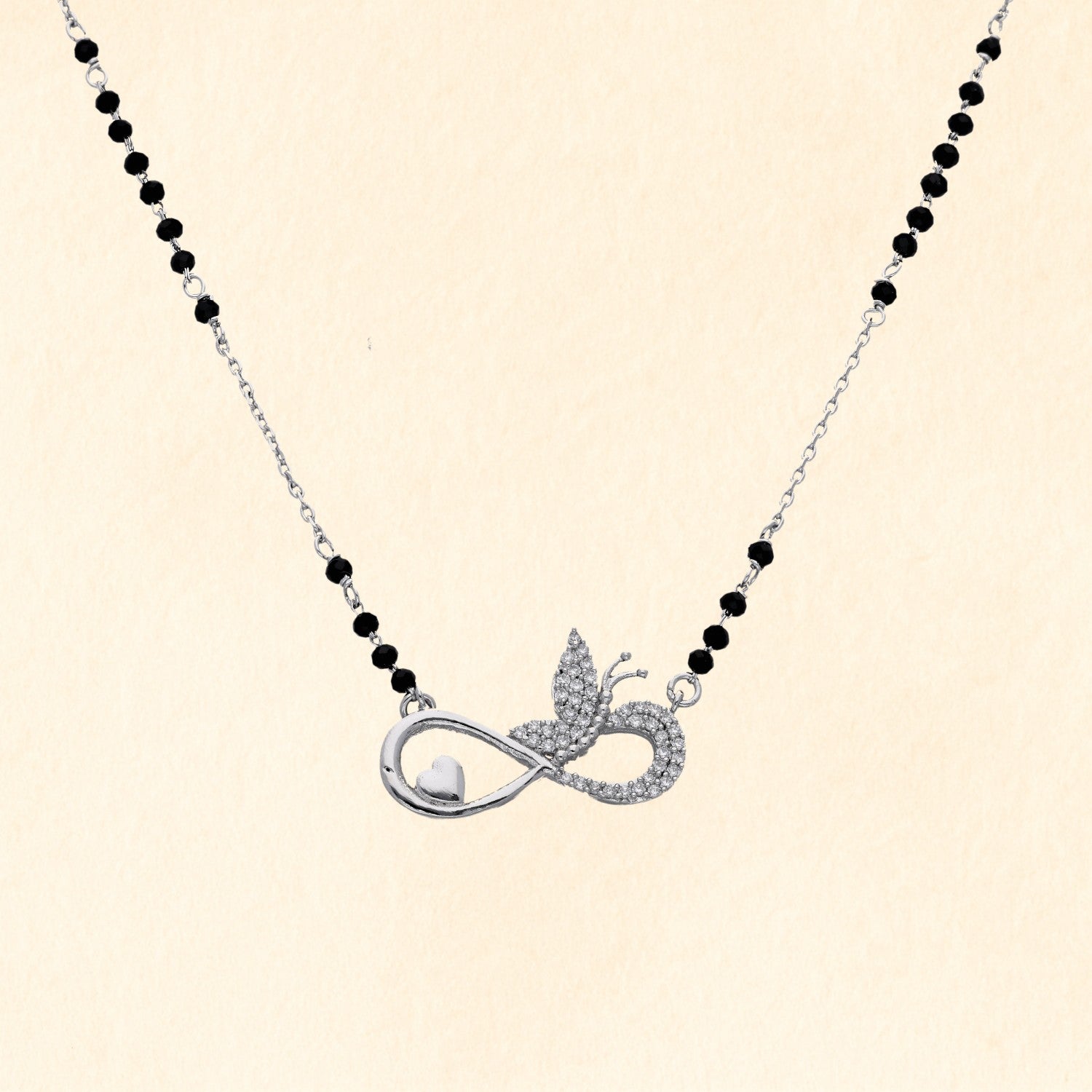 Elegant silver mangalsutra with black beads and a sparkling butterfly infinity pendant, perfect for daily wear and gifting.