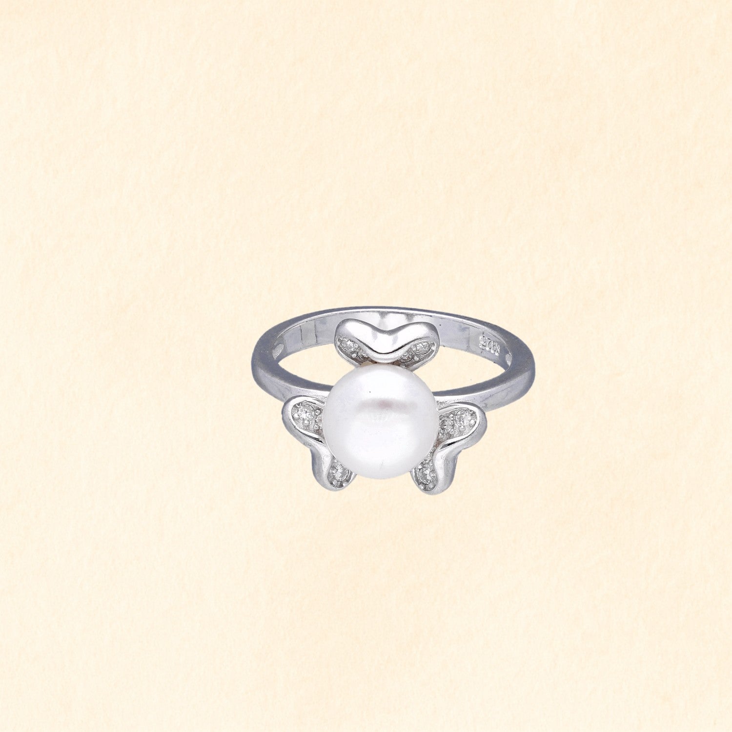 Crafted in 92.5 sterling silver, this elegant finger ring features a luminous pearl set between delicate heart accents with zircon details, making it a timeless piece for everyday elegance or gifting.