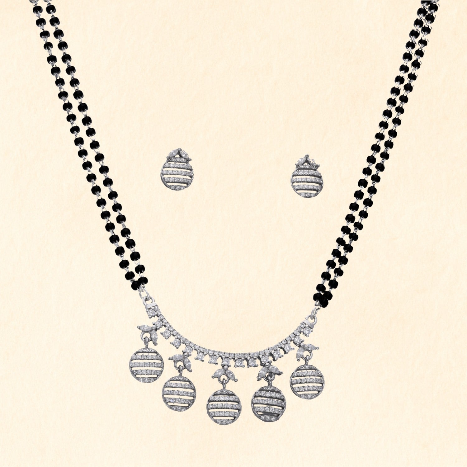 Stylish silver mangalsutra set featuring striped CZ drop pendants with matching earrings, designed for elegant daily and festive wear.