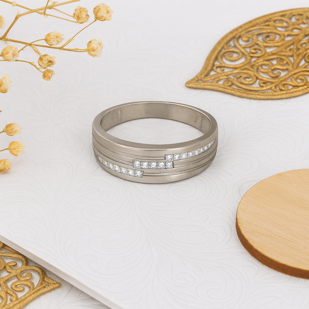 Crafted in 92.5 silver, this refined band features triple rows of neatly spaced stones—designed for sleek, everyday elegance.